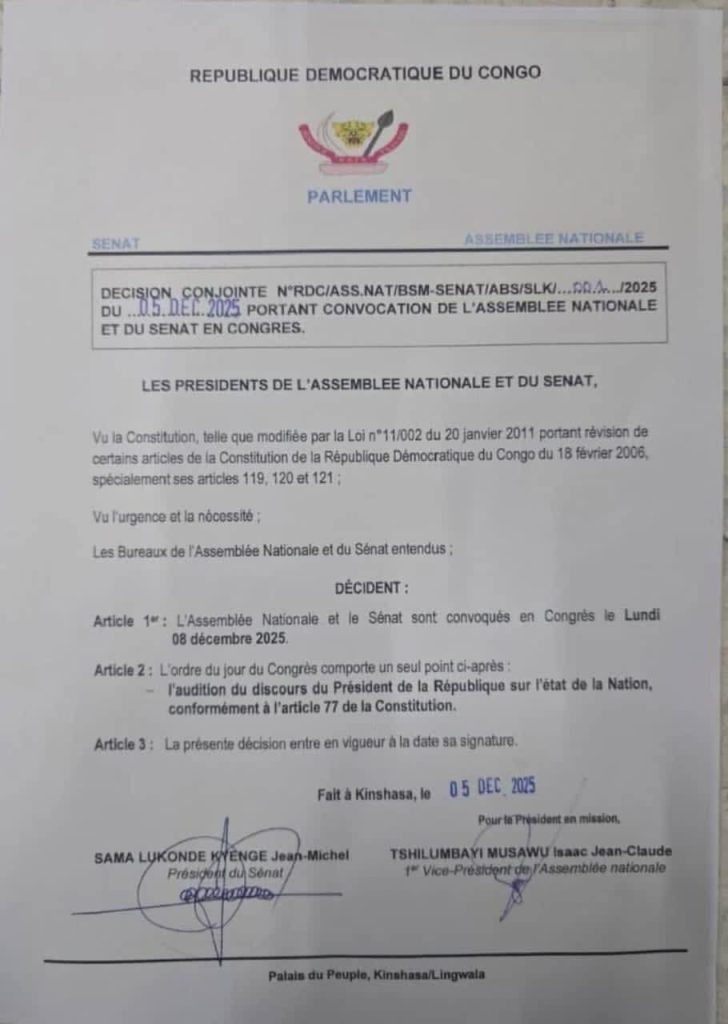 Le Président de la République, Félix Tshisekedi, prendra la parole ce lundi 8 décembre devant le Congrès, réuni exceptionnellement à l’occasion d’une session conjointe des deux chambres du Parlement.