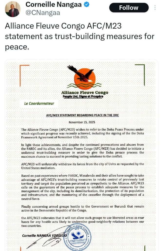 Dans un communiqué daté du 15 novembre et diffusé sur les réseaux sociaux par son coordonnateur Corneille Nangaa, l’AFC/M23 indique que cette décision s’inscrit dans le cadre du processus de paix de Doha, marqué récemment par la signature d’un accord-cadre.