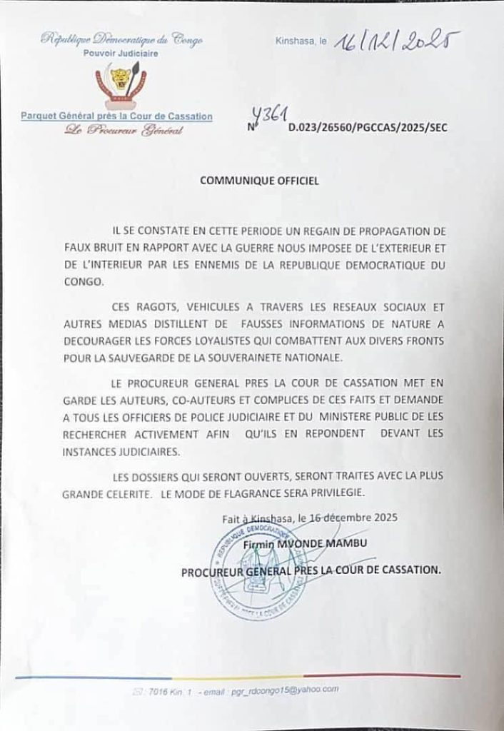 Kinshasa, 16 décembre 2025 (leglobe.cd). Le Procureur général de la République démocratique du Congo (RDC) a ordonné aux officiers de police judiciaire et aux magistrats du ministère public de rechercher activement les auteurs, coauteurs et complices de la propagation de fausses informations concernant le conflit dans l’Est du pays, a-t-on appris mardi.